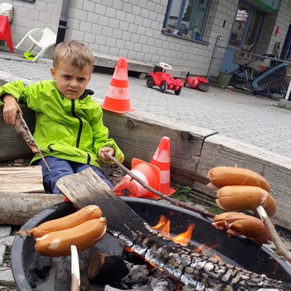 Es war wunderschönes Wetter. Wir trugen das schwere Holz in den Garten und holten die Feuerschale hervor. Gespannt sassen wir um die Schale und halfen mit, ein Feuer zu fertigen. Das Feuer wurde immer grösser und grösser. Wir sassen um das Feuer und beobachteten, wie es sich im Winde bewegte. Dann steckten wir unsere Cervelats an einen Stock und hielten den ins Feuer. Innerhalb von kürzester Zeit roch es in unserem Garten lecker nach feinen Würsten und wir genossen das Essen und das Beisammensein.