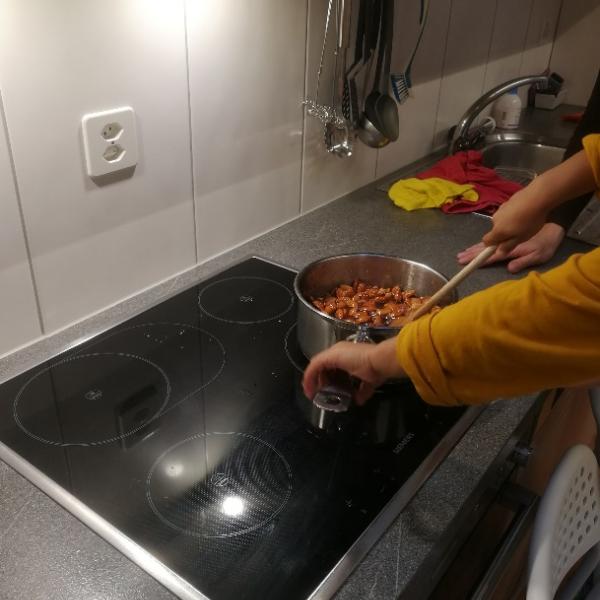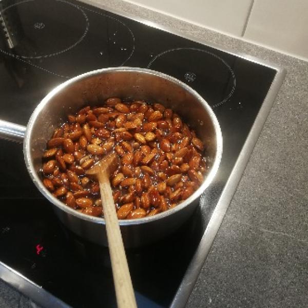 Draussen wehte ein kalter, stürmischer Wind, so dass die Blätter nur so herumflogen. Deshalb entschieden wir uns an diesem Nachmittag drinnen zu bleiben. Karin, unsere Miterzieherin, hatte die Idee, selbst gebrannte Mandeln zu machen. Wir fanden das alle eine sehr tolle Idee. In kürzester Zeit roch es sehr lecker nach Mandeln. Am Abend durften wir dann unsere selbst gebrannten Mandeln an unsere Familien verteilen. Mmmh, das war lecker.