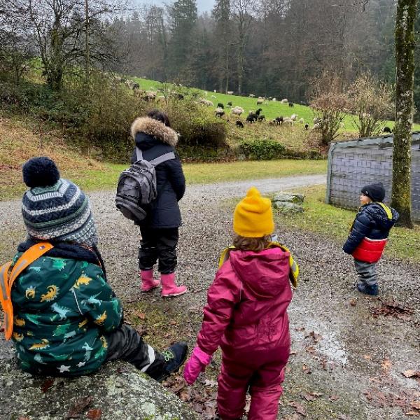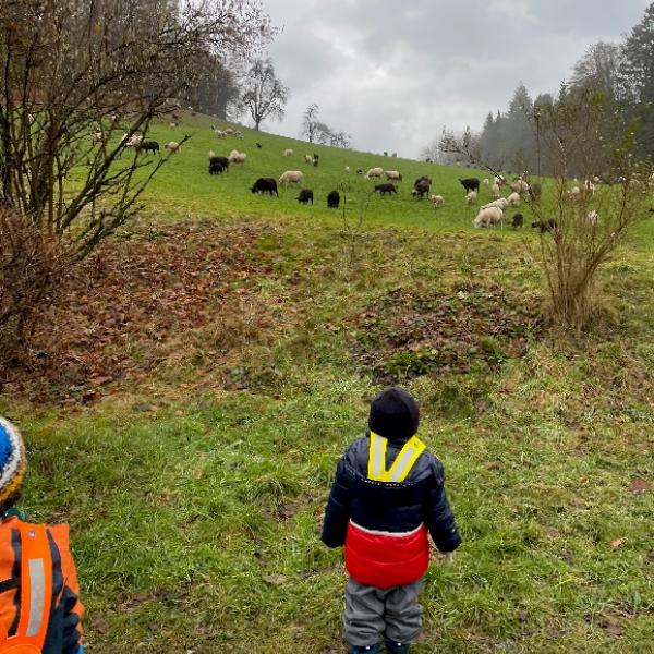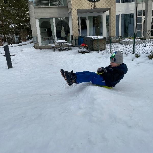 Anfangs Januar gab es sehr viel Schnee. Wir nutzten die Gelegenheit und nahmen unsere Schlitten hervor und rodelten den ganzen Tag. Für die grösseren Kinder und Miterziehenden bauten wir eine grosse Schanze. Da hatten alle grossen Spass. Auf einem unserer Spaziergänge konnten wir die Schafe von unserem Nachbarsbauernhof beobachten, wie sie die Weide wechselten. Leider wurde es draussen viel zu warm, der Schnee schmolz und es regnete in Strömen. Wir widmeten uns unserem Januarthema «Unser Körper». Wir zeichneten unsere Körper und benannten die verschiedenen Körperteile. Es gab viele neue Lieder, zu denen wir unseren Körper bewegen konnten. Am Ende des Monats hatte es doch noch einmal sehr viel geschneit. Dies war perfekt für uns und wir tobten uns nochmal richtig im Schnee aus.