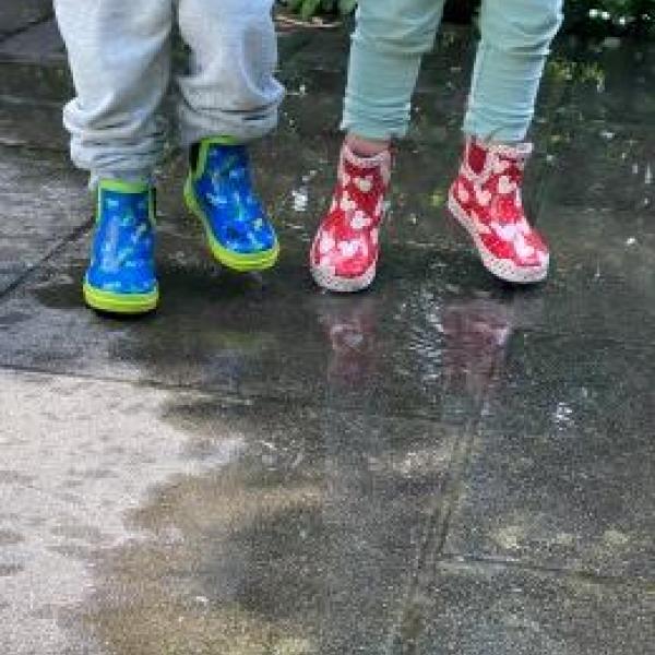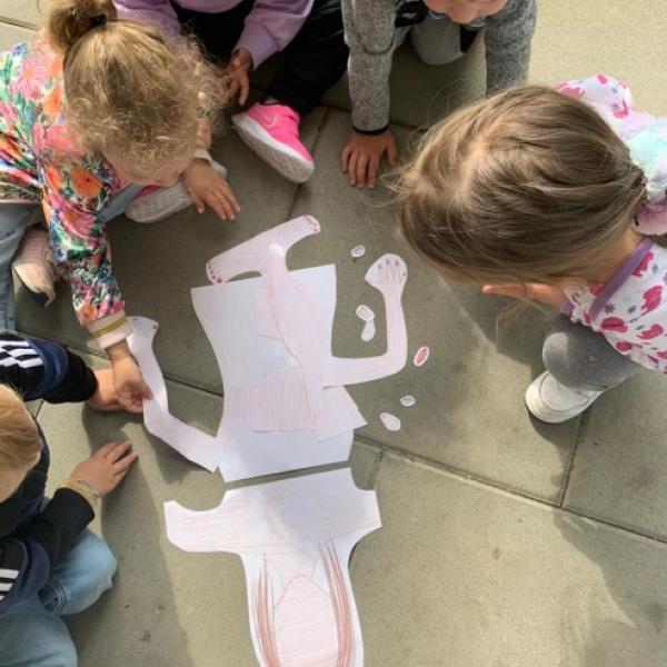 Im Juli lernen wir viel über unseren Körper und die Sinne. Wir benennen die Körperteile, machen Yoga, schmecken und fühlen die verschiedensten Dinge. Da der Sommer momentan eine lange Pause macht und es sehr viel regnet, springen wir durch die Pfützen, statt in unserem Pool zu baden.