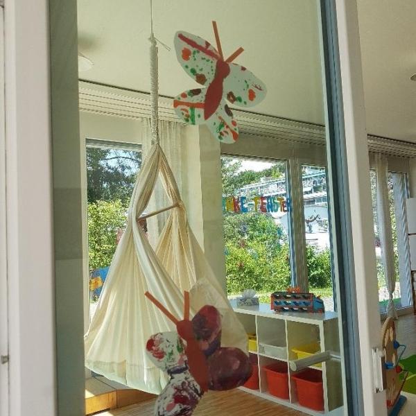 Im Monat Mai konnten wir bereits einige schöne und warme Tage erhaschen. Diese genossen wir draussen im Garten oder beim Aufenthalt im Wald. Im Wald stellten die Kinder mit Stöcken eine Hütte für die Waldbewohner auf. Wir nahmen auch ab und zu das Zvieri mit und genossen das Essen an der frischen Luft. An den schönen Tagen konnten wir ebenfalls das Mittagessen im Garten essen. Um den Frühling in den Räumlichkeiten sichtbar zu machen, bastelten wir Sommervögel und dekorierten unsere Fenster damit.