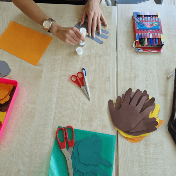Wer sich nun an unserem Winke-Fenster verabschiedet, kann sich an unseren neuen Äffchen, die an Bananenstauden hängen erfreuen. Zudem gestaltete das Team mit den Kindern Handabdrücke am Fenster mit Krallen, die nun Tierpfoten darstellen. Team und Kinder sind im Dschungelfieber. Papageien und Schlangen hängen an Lianen. Auch der Geburtstagskalender im Einstein ist bald fertig. Dann hängen Tiger, Affen, Koalas und Giraffen an der Wand und erinnern an die Geburtstage der Kinder.