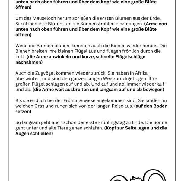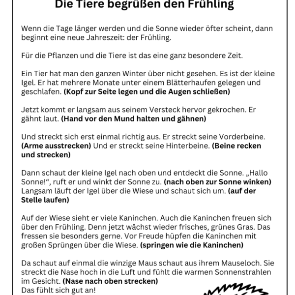 Ein zentrales Angebot ist unsere Bewegungsgeschichte zum Frühling. In dieser Geschichte begleiten die Kinder spielerisch den Übergang vom Winter zum Frühling. Durch verschiedene Bewegungen schlüpfen sie in unterschiedliche Rollen. Die Kinder erleben hautnah, wie der Frühling erwacht und welche vielfältigen Facetten diese Jahreszeit mit sich bringt.